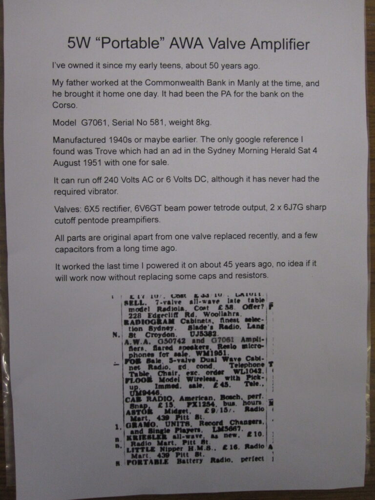 5 watts public address (PA) amplifier, can run on 6volts and it has a handle … so ti’s portable! Runs with a vibrator but has never been tested on batteries, otherwise can run on main. And it only weights 8kg!