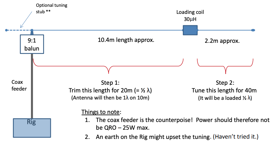 Geoff VK2TGO recently gave a lecture on an end fed antenna for 40-20-10m. This antenna is fed using a 9:1 unun, just under 13 metres of wire and a loading coil near one end. The antenna wire itself can be deployed in many ways: vertically, as an inverted V (with the feedpoint at one of the low ends) or as a sloper.