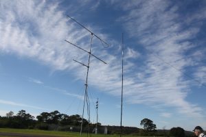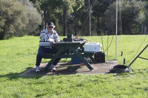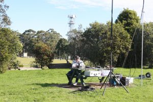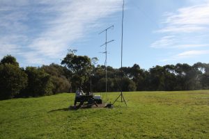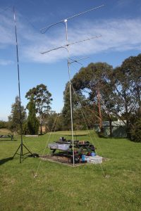 A late decision to enter the winter VHF/UHF contest saw Nick VK2FS and Greg VK2XE set up a station close to the Pony Club near to the club’s repeaters. Beautiful weather allowed for a smooth set up with a dipole at around 7m up a squid pole for 50MHz and a 6m mast with yagis for 144MHz, 432MHz and 1296MHz. The dipole for 6m arrived on site as a dipole for a somewhat lower frequency however following some calculations on the fly and the application of wire cutters, it was persuaded to resonate close to 50MHz. Separate radios were set up for each band with an IC-7300 used on 6m, an IC-7000 on 2m, another IC-7000 for 70cm and an FT-817 running on 144MHz driving a Kuhne transverter for 1296MHz.