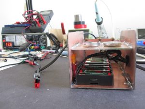 With a mobile whip adapter, so that the radio front doesn’t take the load/stress from the 2m long whips. It also allows the use of an antenna analyser. The antenna mount box attaches to the 3 hinge bolts and is held onto the ammo box by 2 magnets. It also holds a 10 x AA battery pack to double the battery capacity.