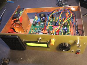 So here is my µBITX project, for the price of 2 crystals for a Codan lunch box, I get a full HF rig! It had to go into an ammunition box, a bit tight in one of the dimensions, and if I was to do this again, it would probably remote the Arduino/display board to provide an additional 9mm of depth. All plugs, buttons are on the top. The speaker is from an old mobile phone car kit.