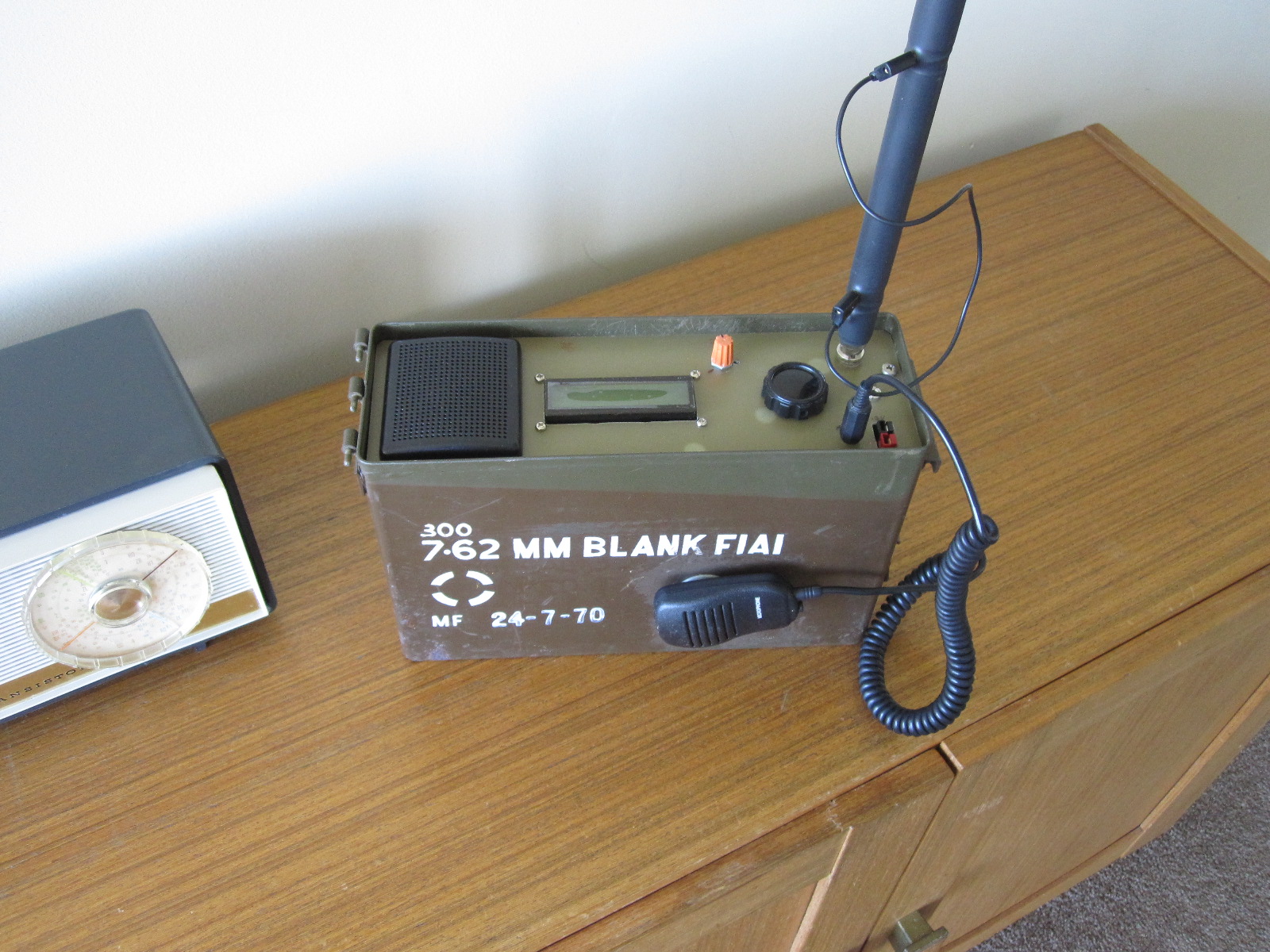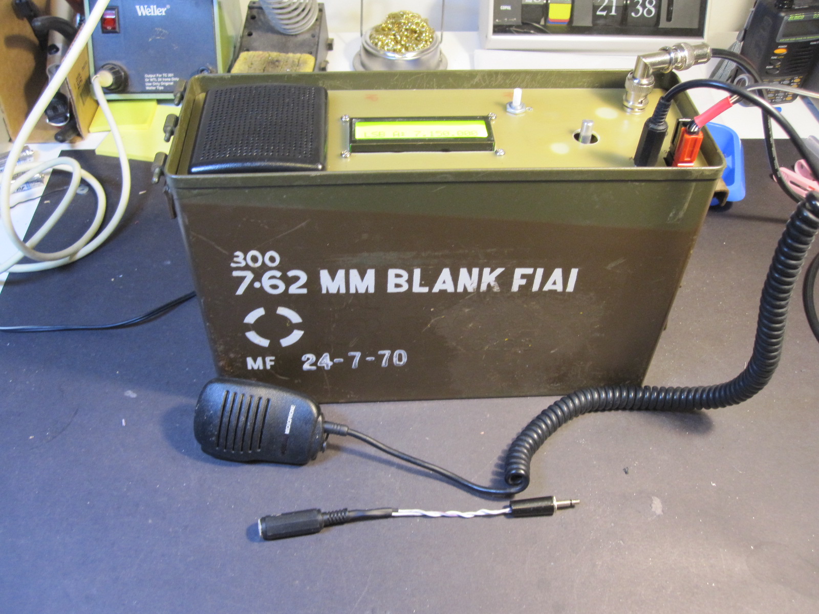 So here is my µBITX project, for the price of 2 crystals for a Codan lunch box, I get a full HF rig! It had to go into an ammunition box, a bit tight in one of the dimensions, and if I was to do this again, it would probably remote the Arduino/display board to provide an additional 9mm of depth. All plugs, buttons are on the top. The speaker is from an old mobile phone car kit.